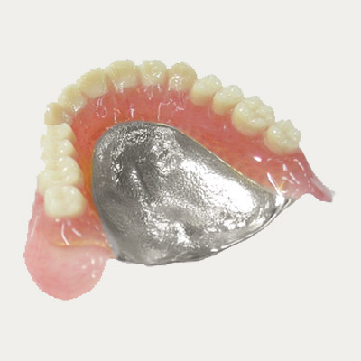 土台となる義歯床がすべて金属でできているものです。熱を伝えやすい薄い金属なので少ない違和感で装着する事が出来ると思います。